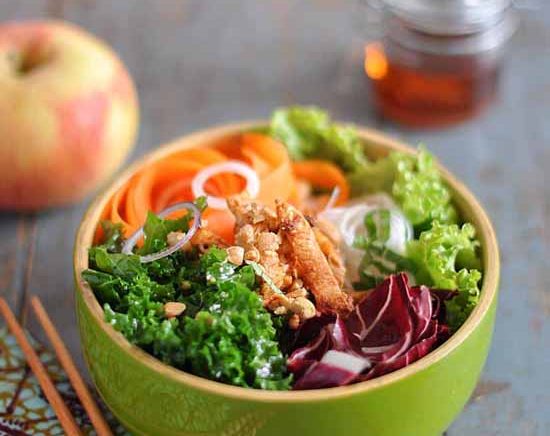 - Oter les nervures centrales des feuilles du chou kale. Les rincer à l’eau et les sécher dans une essoreuse à salade (ou dans un torchon) puis les ciseler grossièrement.