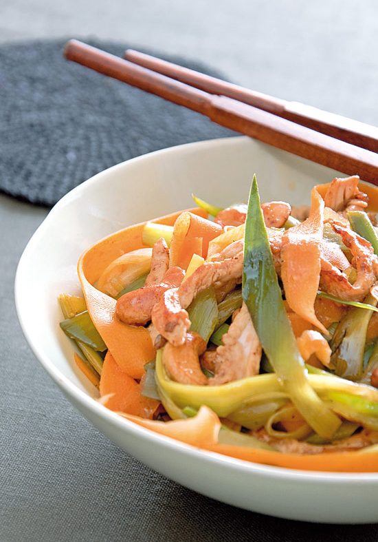 - Peler les carottes et les tailler en tagliatelles à l'économe ou au rasoir à légumes. Réserver.