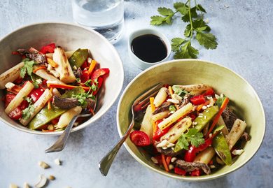 Wok de scorsonères au bœuf, coriandre, carotte, pois gourmand, poivron