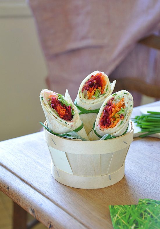 - Coupe-les en biais en deux parties égales puis présente-les à tes convives. Tu peux entourer les wraps d’un brin de ciboulette pour faire joli.S’il te reste de la carotte et de la betterave, prépare-les en salade avec une vinaigrette à l’huile de noix ou de noisette ; un délice !