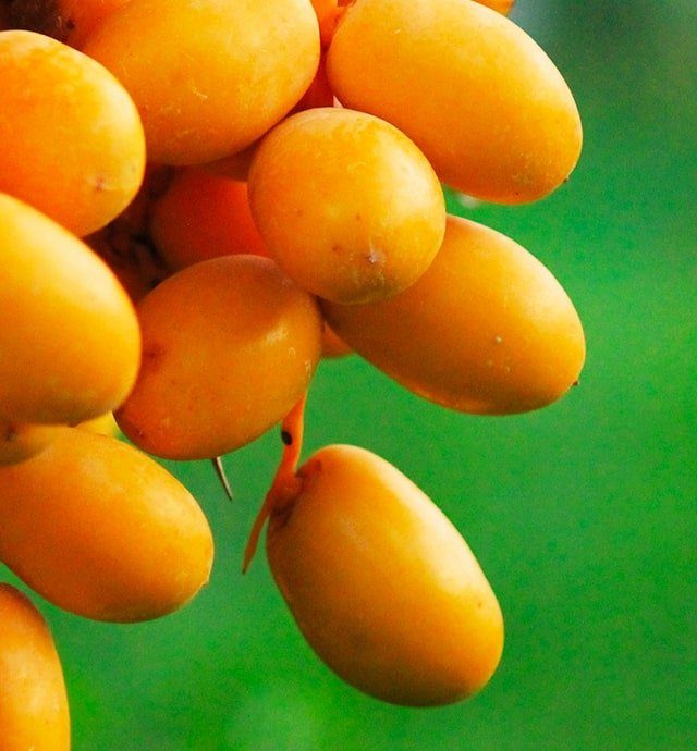 - A la fin de l’hiver, les premières dattes apparaissent. Elles sont de couleur noire ou verte, regroupées en grappes à la base des feuilles de palmiers-dattiers. Il faut attendre les chaleurs de l’été et celles de l’automne pour que les précieux fruits atteignent leur taille définitive, se colorent de jaune et renferment leur saveur sucrée.