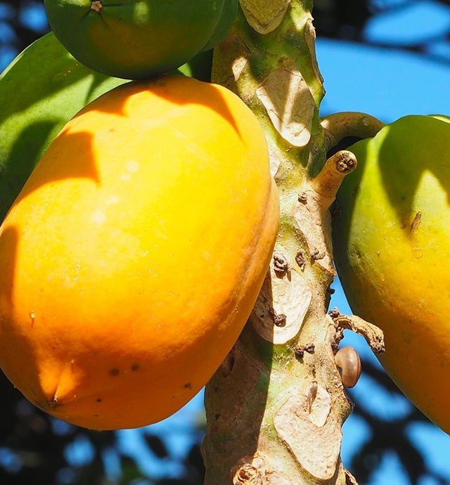 Recouverte d’une peau verte, la papaye est prête à consommer quand cette peau se colore de jaune et que cette teinte recouvre un tiers du fruit. À maturité, le goût de sa chair s’approche d’un mélange de melon et de pêche.