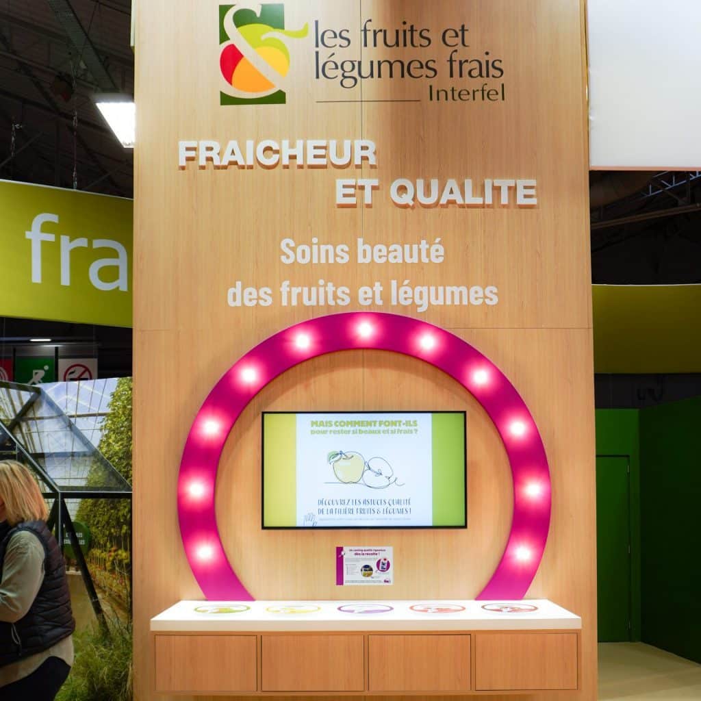 Le stand vous accueillera avec des dispositifs ludiques et interactifs pour en savoir plus sur les fruits et légumes frais : bornes d’arcade, borne photo, quiz, vélo smoothie…