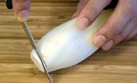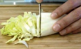 Posez l’endive sur le plan de travail et taillez-la à votre convenance (ici finement émincée).