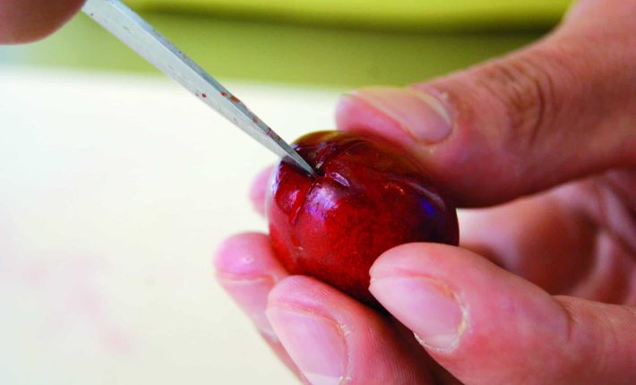 A l’aide de la pointe d’un couteau d’office, pratiquez une petite incision en forme de croix à la base de la cerise (à l’opposé du pédoncule).