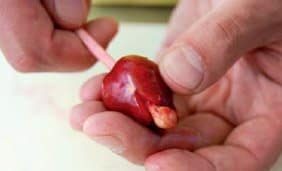 Par cette incision, poussez ensuite délicatement sur le noyau à l’aide d’une baguette chinoise (ou d’une pique à brochette en bois, côté plat).