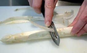 - soit avec un économe, La première consiste à retirer seulement la peau externe des asperges en les tenant fermement par le bout opposé à celui que vous tenez dans votre main.