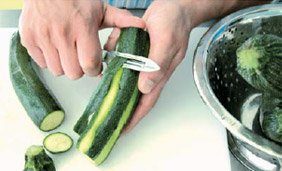 Selon l’utilisation, épluchez les courgettes complètement ou laissez un passage de peau sur deux à l’aide d’un économe. -