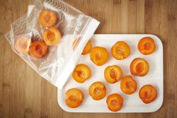 - Pré-congeler les demi-abricots : disposer les oreillons d’abricots côté peau dans un plat en veillant à bien les espacer. Placer le plat au congélateur jusqu'au durcissement des abricots.