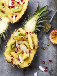 - Verser ce smoothie dans les deux coques d’ananas et le décorer avec les cubes d’ananas restants, des rondelles de kiwi, des copeaux de noix de coco, une tranche de carambole, des graines de grenade et la pulpe du fruit de la passion.