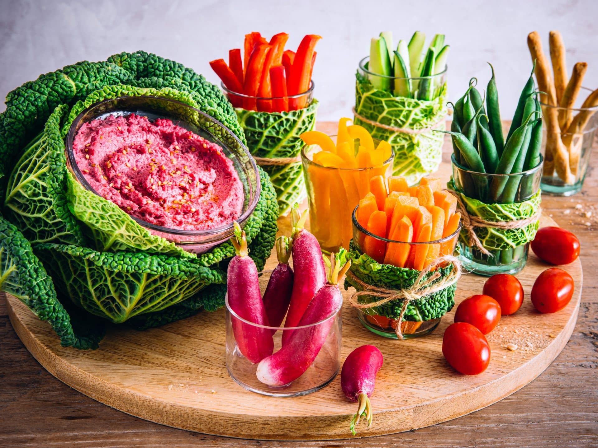 - À l’aide d’un petit couteau, creusez le cœur du chou (conservez-le pour une autre recette) et disposez le bol de houmous au cœur du chou. Servez avec tous les légumes.