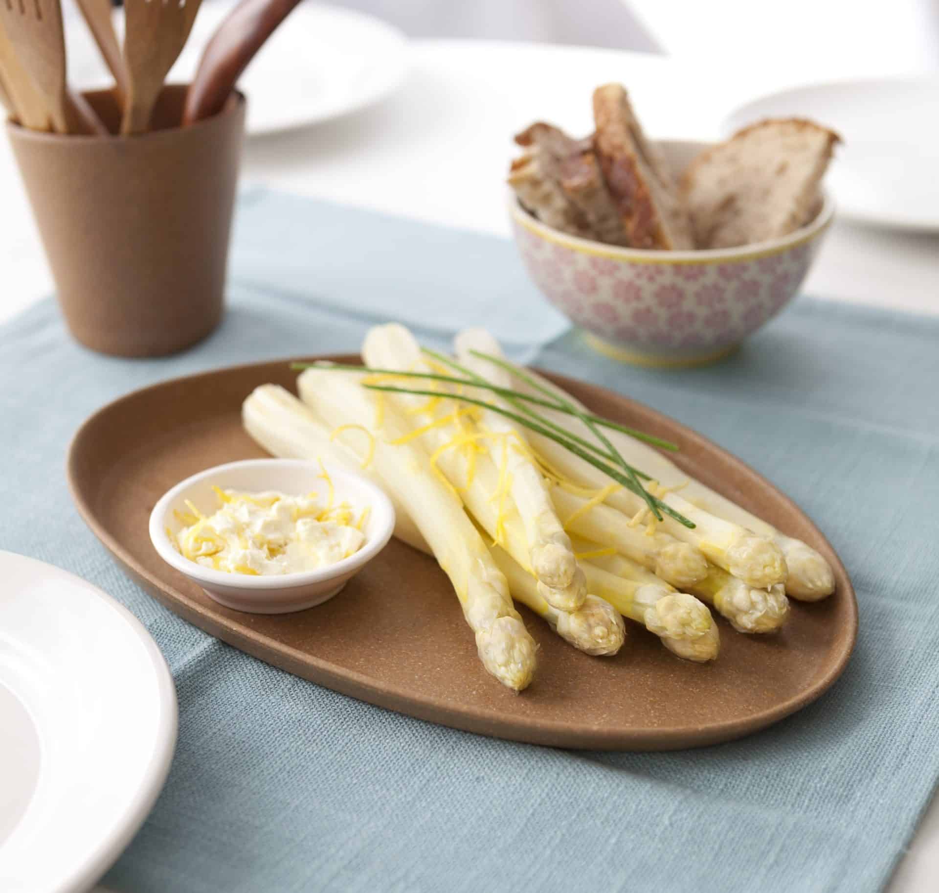 Pendant la cuisson des asperges, verser le mascarpone dans un bol avec la crème. Saler légèrement. Zester le citron et mélanger les zestes au mascarpone.