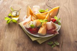 Assiette de melon, tomate-mozza, jambon et basilic
