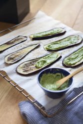 - A la sortie du four, tartiner les aubergines de cette préparation et servir sans attendre.