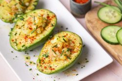 - Garnir chaque demi avocat de ce mélange. Parsemer de fleur de sel, de piment d’Espelette et arroser d’un filet d’huile d’olive.