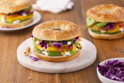 Bagel avocat, chou rouge, saumon fumé et mangue