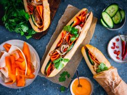 - Finalisez la cuisson des baguettes au four selon les indications du paquet. Puis coupez-les en deux. Mélangez la mayonnaise avec la sauce Sriracha et tartinez-en le pain, ajoutez les lamelles de viande, les légumes égouttés et des rondelles de concombre. Refermez les banh mi et servez.