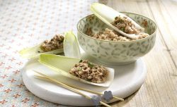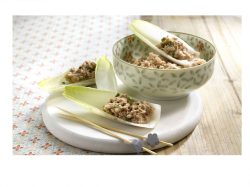 Garnis ensuite la partie la plus large des feuilles d'endive de cette préparation (la partie la plus « élancée » de la feuille servira à se saisir de la barquette sans se salir les doigts).