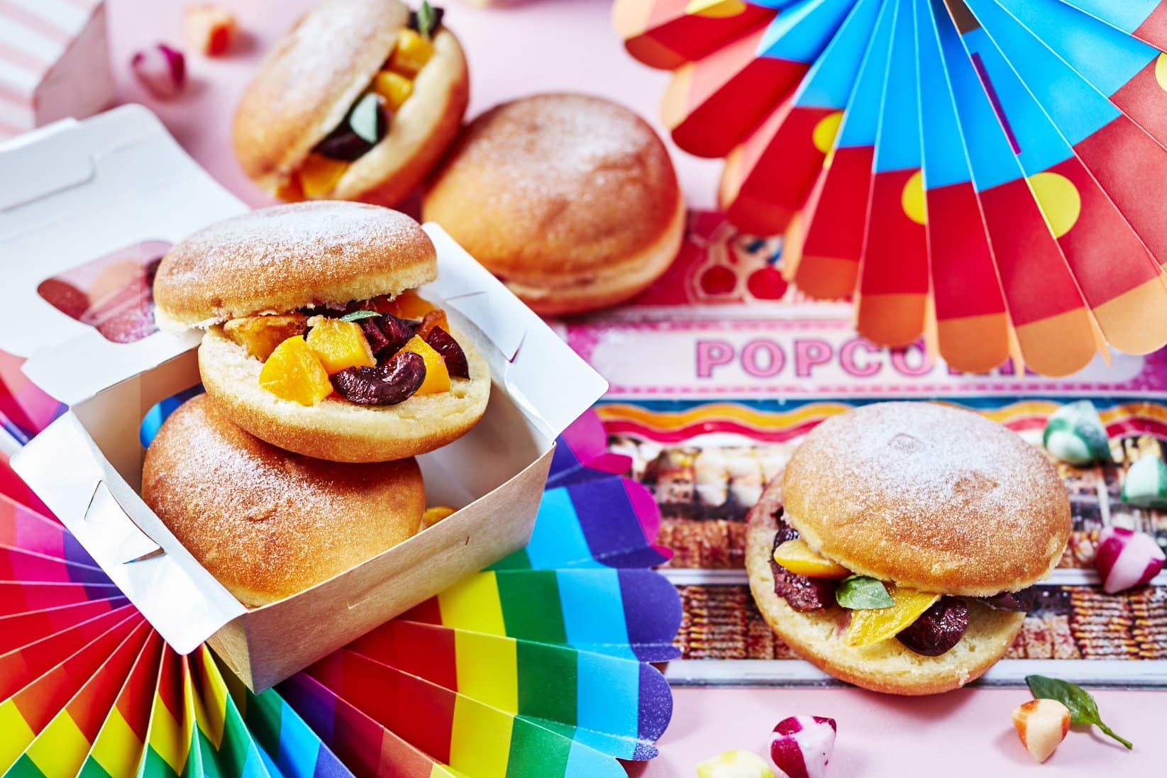 - Ouvrir les beignets en deux, comme un burger, garnir de morceaux de fruits frais et de quelques feuilles de basilic et refermer le beignet !