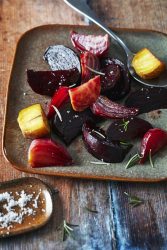 - Laver et couper les betteraves en quartiers. Les arroser du mélange huile d’olive/sirop d’érable. Les déposer dans un plat et enfourner pendant 40 minutes environ jusqu’à ce qu’elles soient tendres. Parsemer de romarin frais juste avant de servir.