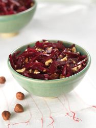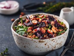 - Parsemer la salade de betteraves de noisettes encore chaudes, pour de savoureux contrastes chaud-froid et croquant-moelleux !