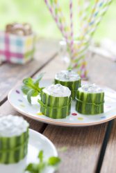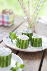 - Garnis les bouchées de concombre de cette préparation. Noue autour de chaque bouchée un brin de ciboulette.