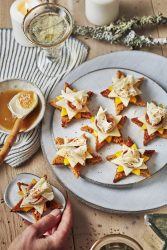 - Griller les tranches de pain d’épice et tailler des formes de taille légèrement supérieure aux fruits.