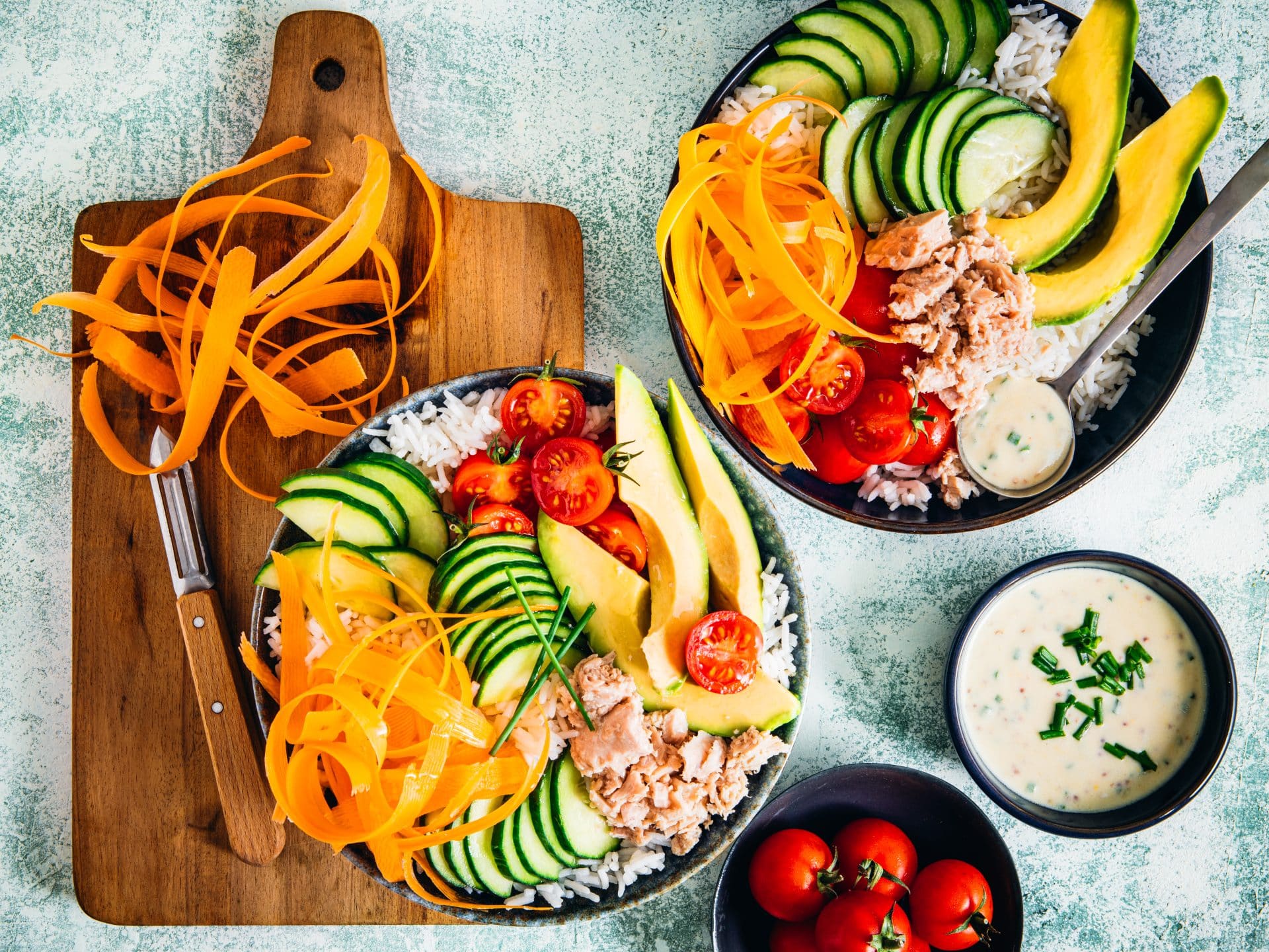 - Répartissez le riz froid dans 4 bols. Disposez harmonieusement par-dessus les crudités et le thon. Arrosez de sauce yaourt au moment de servir.