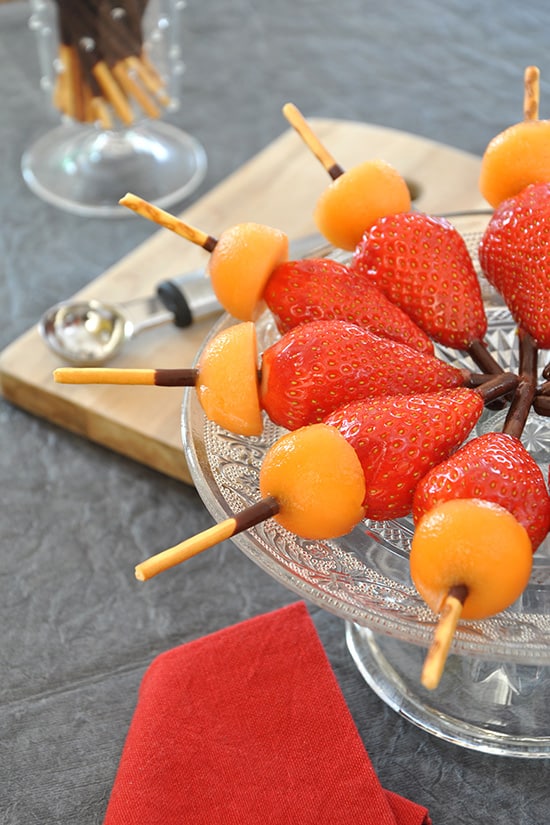 - Perce les billes de melon et les fraises à l’aide de la pique en bois ; de cette façon ce sera plus facile de les piquer sur les mikados.