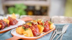 - Couper les filets de lotte en morceaux à la taille des cubes de melon.