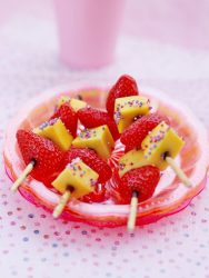 En option, décore tes brochettes d’une fine pluie de perles de sucre colorées. Personne ne pouvant résister à ce dessert, une précaution est bien inutile : déguster la brochette avant que le biscuit ne ramollisse.