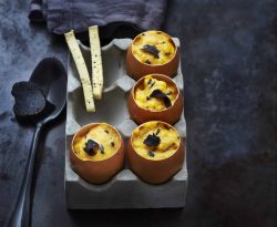 En option : placer la truffe avec les œufs (coquille lavée et séchée) pendant quelques jours dans une boîte hermétique au réfrigérateur (de sorte qu’elle imprègne de son goût les œufs crus dont la coquille relativement poreuse laisse passer les arômes puissants).