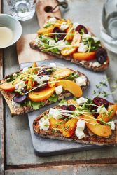 5. Tartiner les tranches de pain de gorgonzola. Déposer des feuilles de jeunes pousses, quelques morceaux de cerises et des lamelles d’abricots de nos régions.