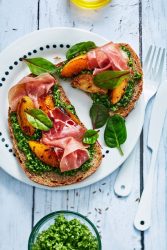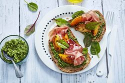 - Répartir le pesto sur le pain, ajouter quelques fruits poêlés, une tranche de jambon de Bayonne en chiffonnade et quelques jeunes pousses.