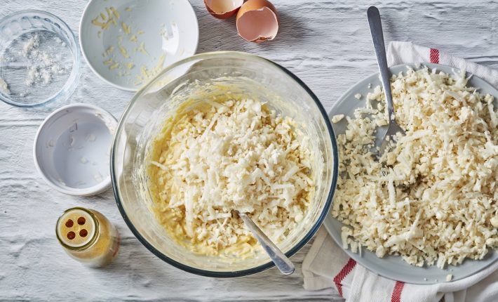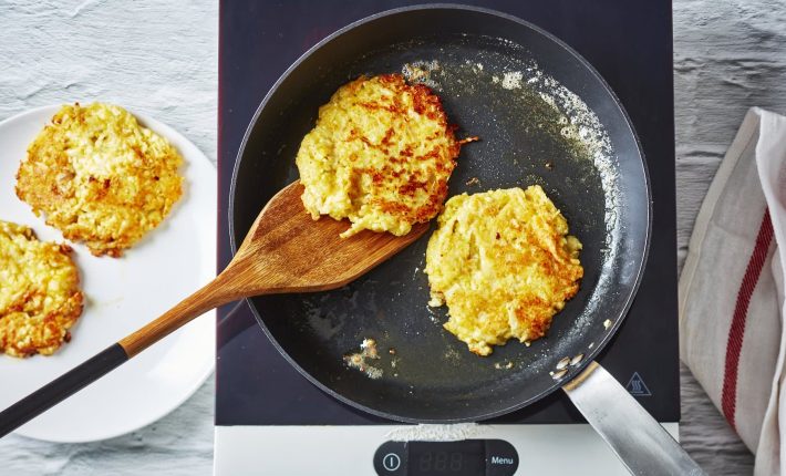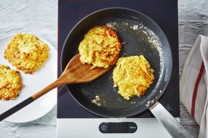 - Faire fondre le beurre dans une poêle et déposer une grosse cuillère à soupe de préparation au chou-fleur de manière à former une galette.