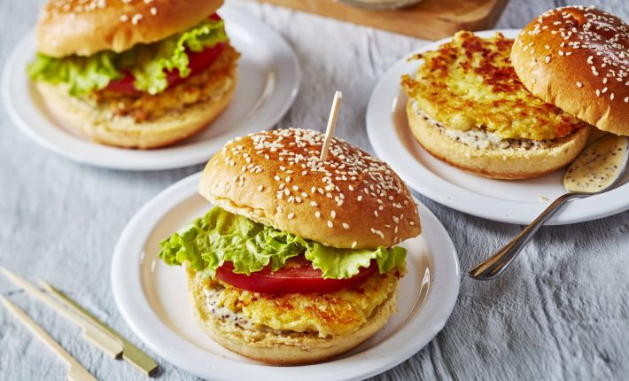- Garnir les fonds de pain à burger d’un mélange de mayonnaise et moutarde à l’ancienne, déposer la galette de chou-fleur au curry. Ajouter une rondelle de tomate et quelques feuilles de salade et déguster aussitôt !