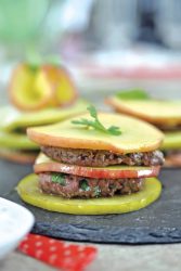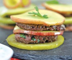 - Monter les burgers : intercaler en hauteur tranches de pomme (les plus grandes) et mini steaks hachés à la coriandre. Servir le reste des tranches de pomme en garniture. Accompagner d’un peu de sauce au fromage blanc et aux herbes.