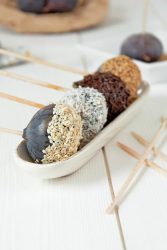 - Enrober chaque figue de caramel de porto puis les rouler au choix dans de la noix de coco râpée, du pralin, des noix ou des noisettes concassées…