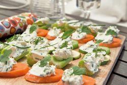 - Canapés de carottes : peler les carottes et les tailler en rondelle légèrement de biais (pour augmenter la surface à tartiner). Mélanger le fromage frais à la coriandre ciselée et tartiner les rondelles de carottes de ce mélange.