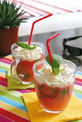 • Dresser les cappuccinos dans des tasses transparentes, la soupe d'abord puis un nuage de chantilly à la mozzarella. Décorer d'un peu de basilic ciselé.