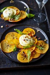 Carpaccio de kaki, roquette, noisettes et chèvre chaud