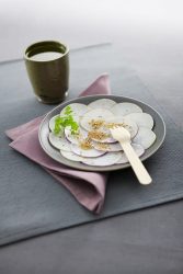 - Peler les navets et les tailler en très fines rondelles (idéalement à la mandoline). Les répartir sur un grand plat de service.