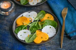 Dans les assiettes, dresse les lamelles de fruits et de légumes en rosace, en alternant avec les pousses d’épinards. Termine en déposant quelques feuilles d’épinards au centre des assiettes.