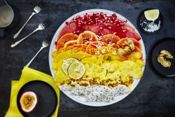 - Découper l’ananas, la papaye, le fruit du dragon et la mangue en fines tranches.