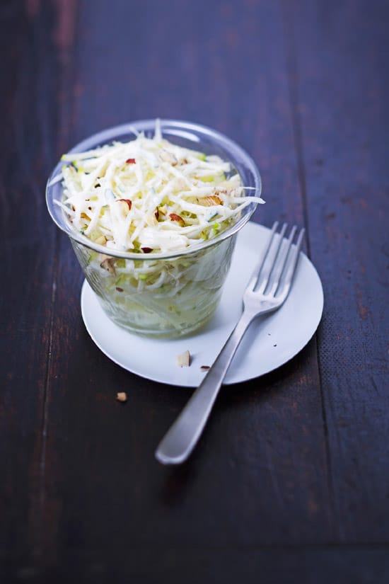 - Dans un saladier, déposer le céleri râpé, les pommes râpées et les noisettes concassées.