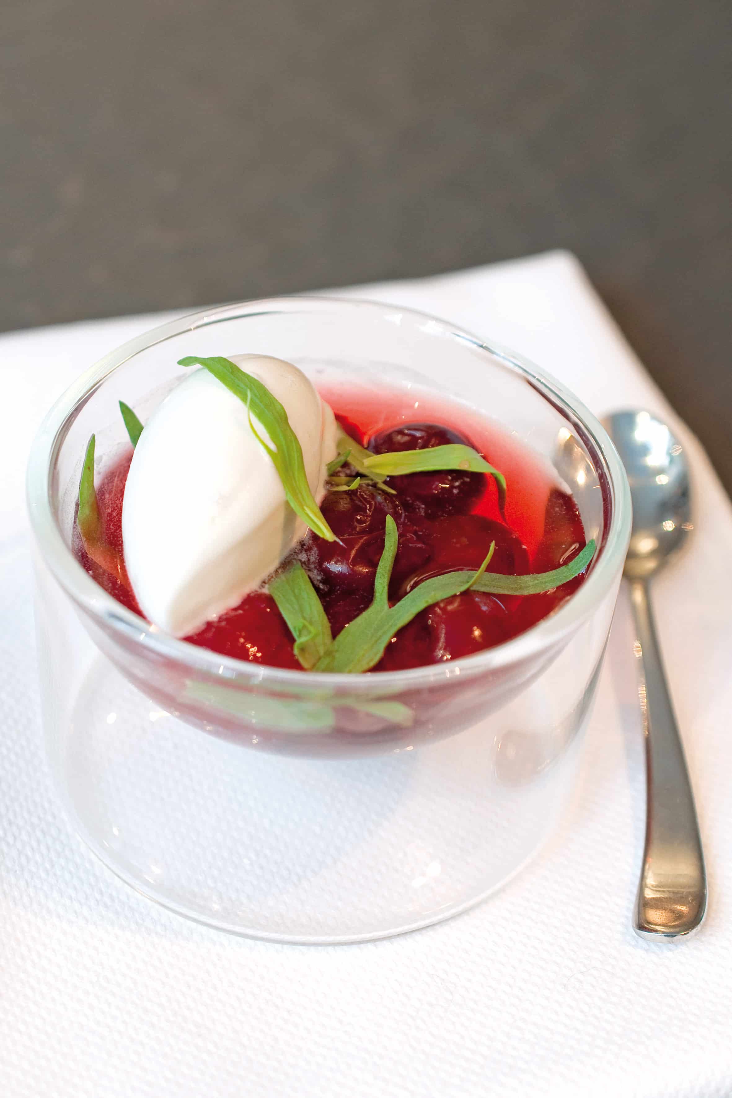 - Déposer, juste avant de servir, une quenelle de crémeux au chocolat blanc sur les cerises et parsemer de quelques feuilles d’estragon.