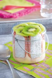 - Monter les charlottes : chemiser 4 verrines avec les biscuits roses (placer les biscuits sur le pourtour des verrines). Dans chaque verrine répartir la crème et décorer de tranches de kiwi. Placer au frais.