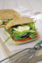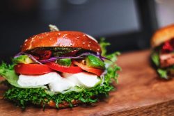 - Monter les hamburgers : déposer les bases (la partie inférieure du pain à hamburger) sur une plaque de cuisson tapissée d’un papier sulfurisé. Garnir avec de fines rondelles de tomate, un peu de roquette, des lanières de courgette et terminer par la mozzarella. Composer les 3 autres hamburgers de la même façon.
