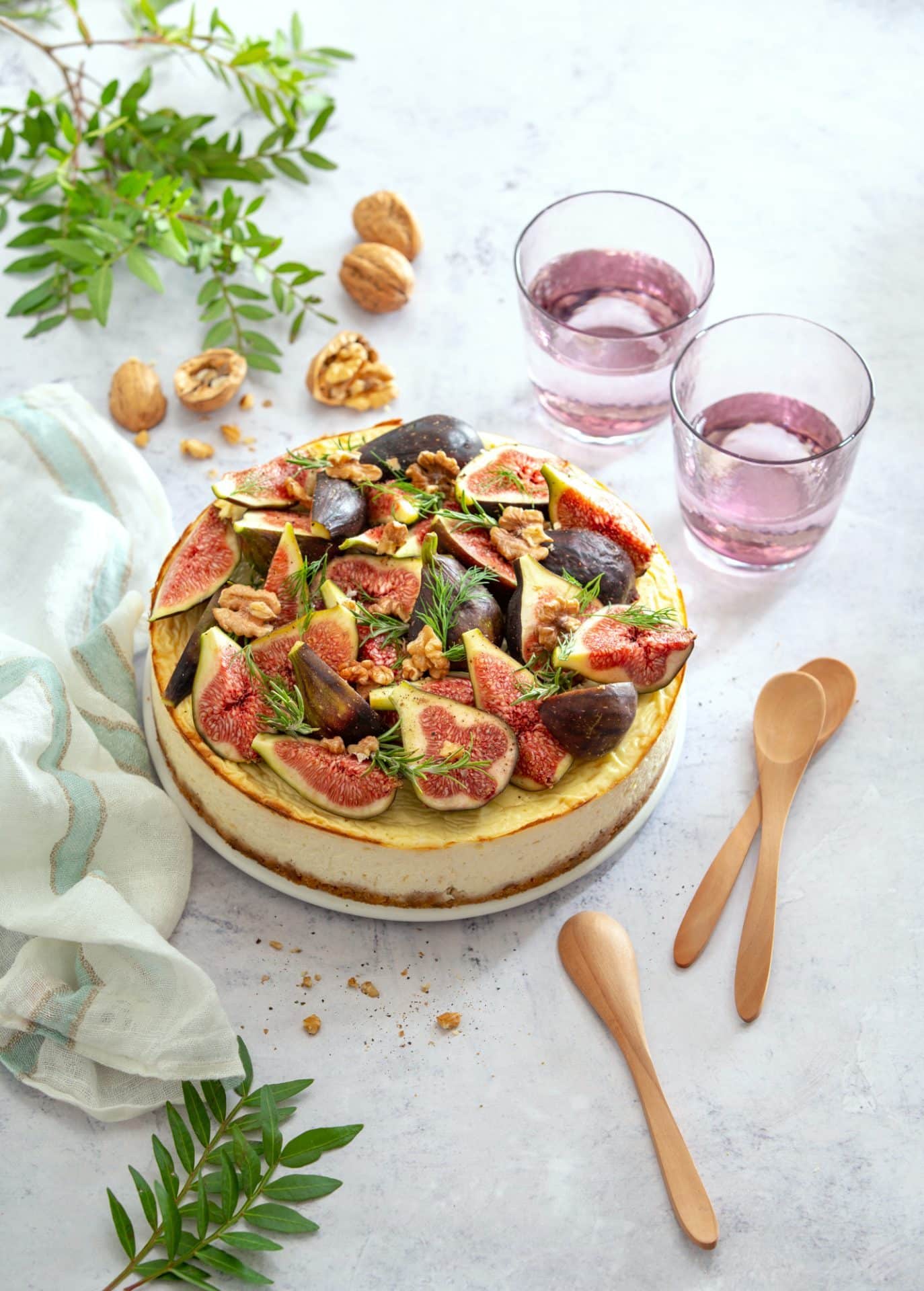 - Au moment de servir, rincez les figues et découpez-les en quartiers. Disposez-les sur le dessus du cheesecake avec quelques cerneaux de noix et quelques brins de romarin.