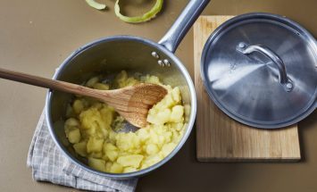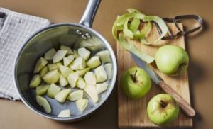 - Dans une casserole, faire cuire les pommes dans un fond d’eau. Laisser cuire à couvert à feu moyen pendant 20minutes environ. Réserver.